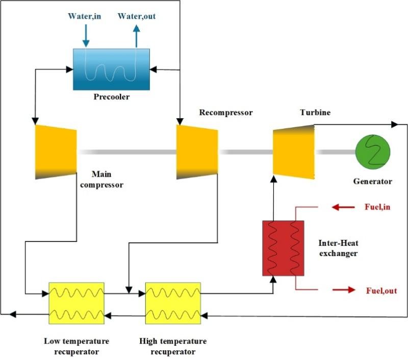 Le système utilise du CO₂ supercritique comme fluide de travail et assure une conversion efficace de la chaleur en électricité grâce à un cycle fermé, sans changement de phase gaz-liquide au sens traditionnel du terme. Le cycle comprend six étapes clés : le fluide de travail, initialement à basse température et basse pression (33 °C, 8,1 MPa), est comprimé à 20-23 MPa. Il traverse ensuite successivement un récupérateur basse température et un récupérateur haute température afin de récupérer la chaleur résiduelle et d’élever sa température. Puis, il est chauffé par un réchauffeur (utilisant des sources de chaleur telles que la chaleur résiduelle industrielle ou l’énergie solaire thermique) à 500-800 °C et alimente un groupe turbo-alternateur qui produit de l’électricité. Enfin, il est refroidi par un refroidisseur pour revenir à son état initial, bouclant ainsi le cycle. Les données de recherche montrent que lorsque la température d'entrée de la turbine dépasse 550 °C, le rendement thermique du cycle est de 20 à 50 % supérieur à celui d'un cycle Rankine à vapeur classique, et la consommation d'eau est réduite de moitié. Les récupérateurs et le refroidisseur assurent plus de 90 % des échanges thermiques, ce qui les rend essentiels au bon fonctionnement du système.